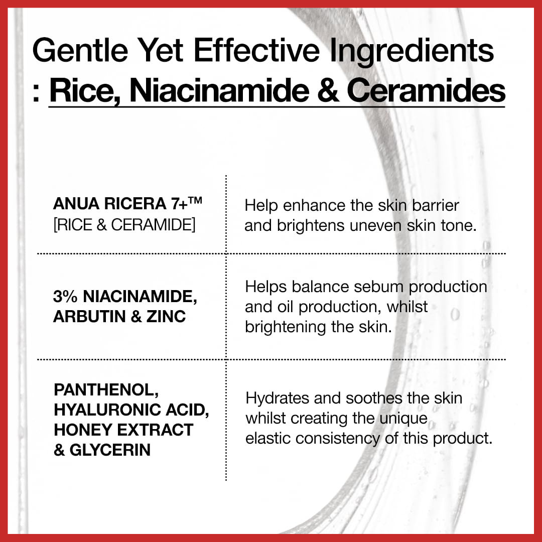 Contains Oryza Sativa (Rice) Extract to brighten uneven skin tone with mild exfoliating effects, promoting a glow complexion.