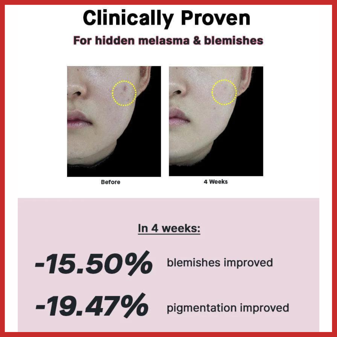 – 19.47% improvement of pigmentation (visible melasma and blemishes)