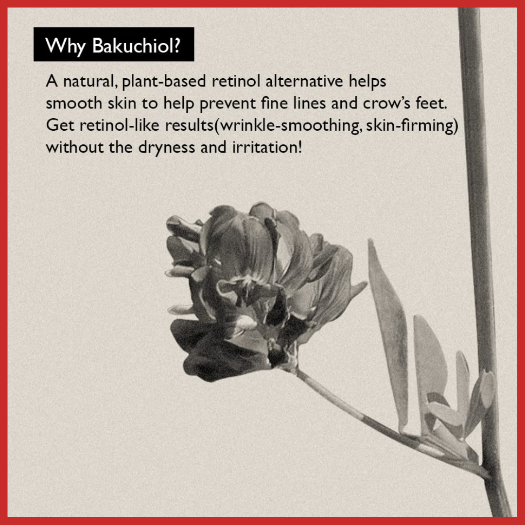 Bakuchiol – A high-purity natural active, a safe alternative ingredient with similar efficacy to antioxidant retinol (vitamin A) without side effects, extracted from the seeds of Psoralea Corylifolia of the legume family, a traditional Ayurvedic medicine.